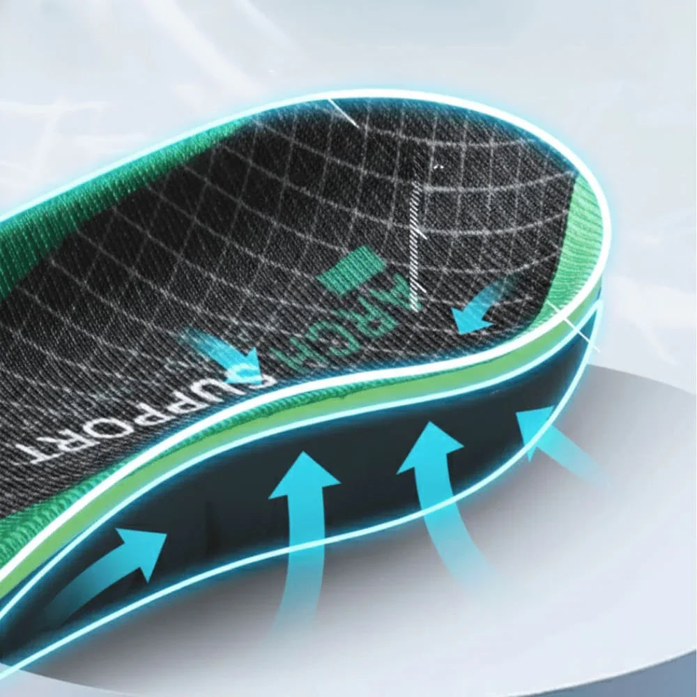Die speziell geformte 3D-Fußgewölbestütze hebt das Fußgewölbe sanft an und sorgt für eine gleichmäßige Druckverteilung. So werden Fußschmerzen gelindert, die Haltung verbessert und der gesamte Bewegungsapparat entlastet.