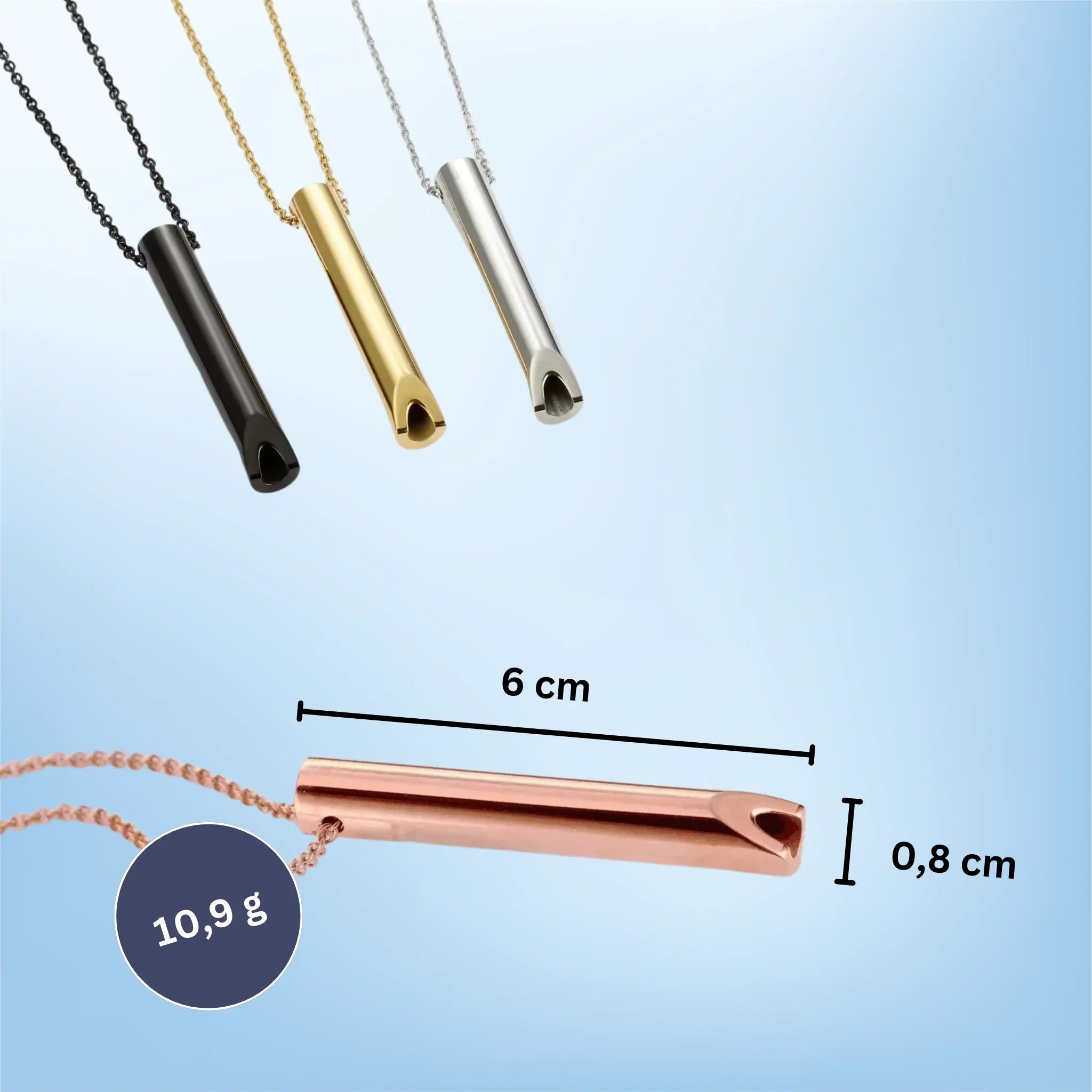 Mit einer Anhängergröße von 6x0,8 cm und einer Kettenlänge von 50 cm plus 5 cm Verlängerung bietet sie nicht nur eine funktionale Lösung zur Entspannung, sondern ist auch ein stilvolles Accessoire für den Alltag.