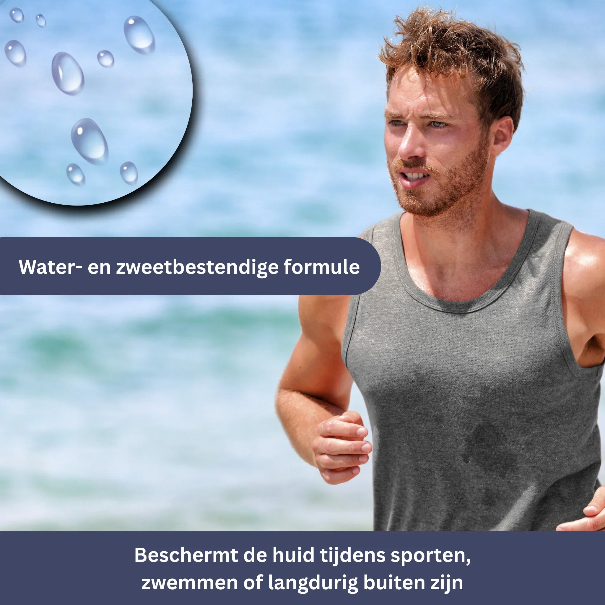 Ja, de water- en zweetbestendige formule biedt betrouwbare bescherming tijdens sport, zwemmen of langere buitenactiviteiten, terwijl het de huid verzorgt en ondersteunt bij herstel.