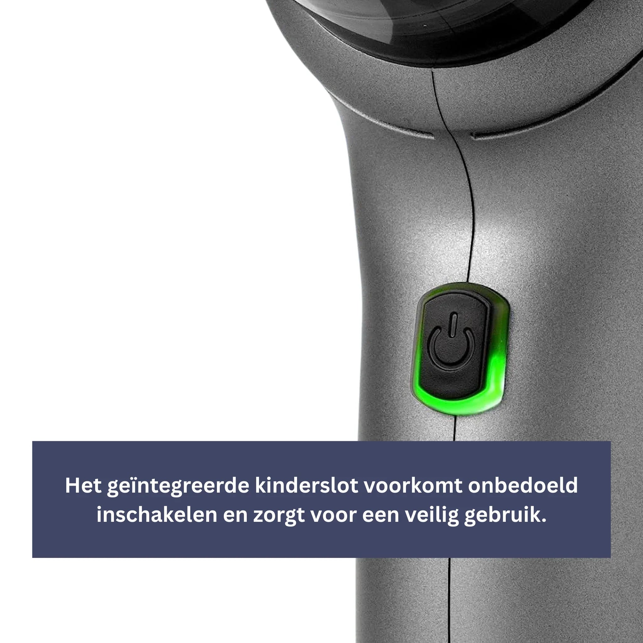 De aan/uit-knop reageert pas na lang indrukken om per ongeluk inschakelen te voorkomen.