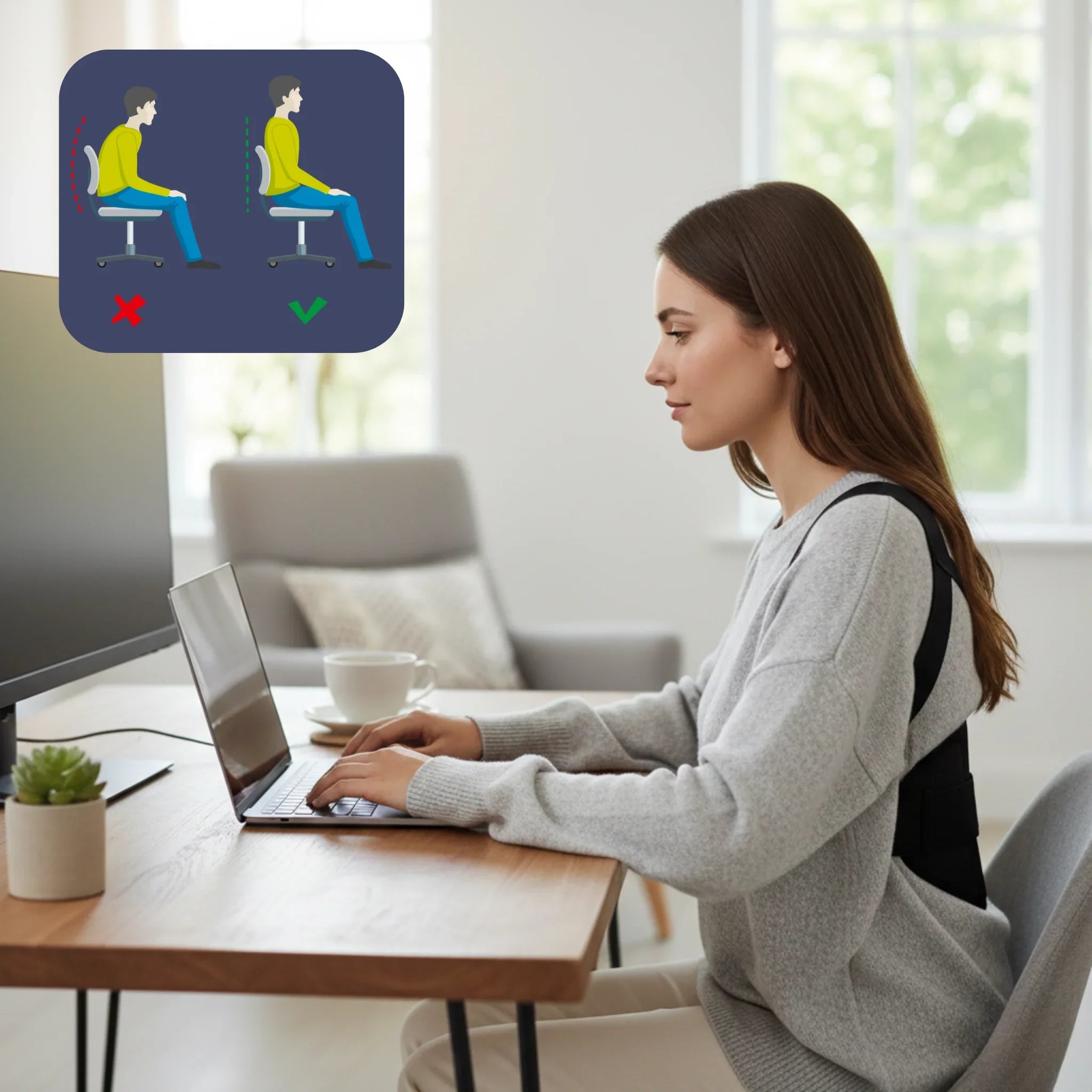 Door de juiste uitlijning te stimuleren, traint het je spiergeheugen, zodat je lichaam vanzelf een rechte houding aanneemt.