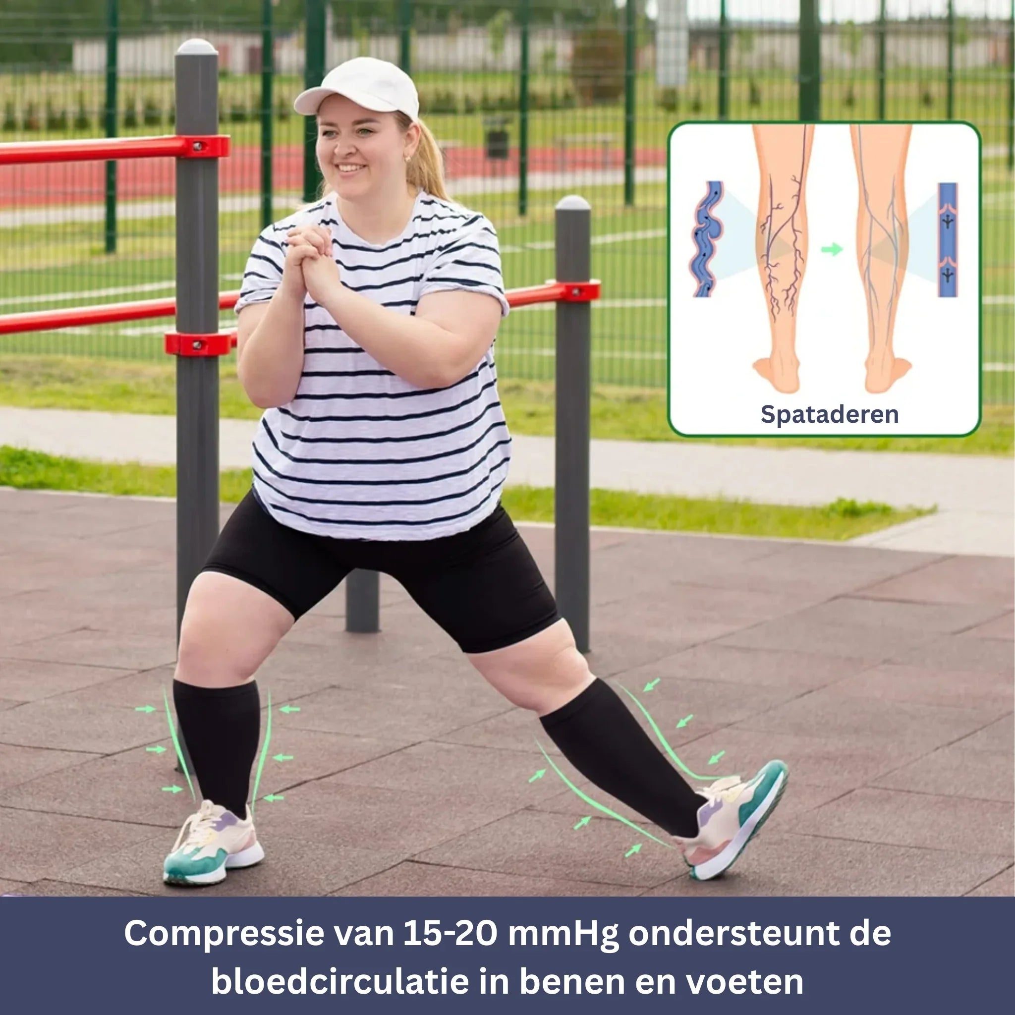 De gerichte compressie (15–20 mmHg) verbetert de doorbloeding, vermindert zwellingen en helpt klachten zoals trombose of beenkrampen te voorkomen.