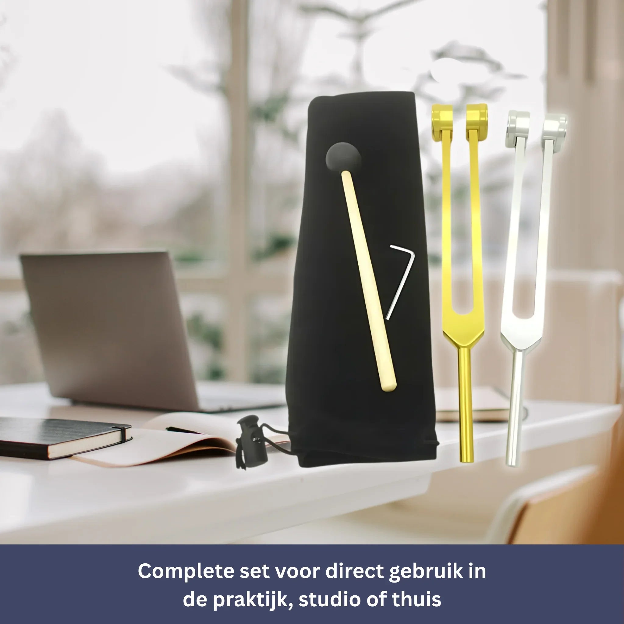 De set bestaat uit een nauwkeurig afgestemde stemvork (128 Hz), een houten klopper voor activatie en een fluwelen zakje voor veilige opberging.