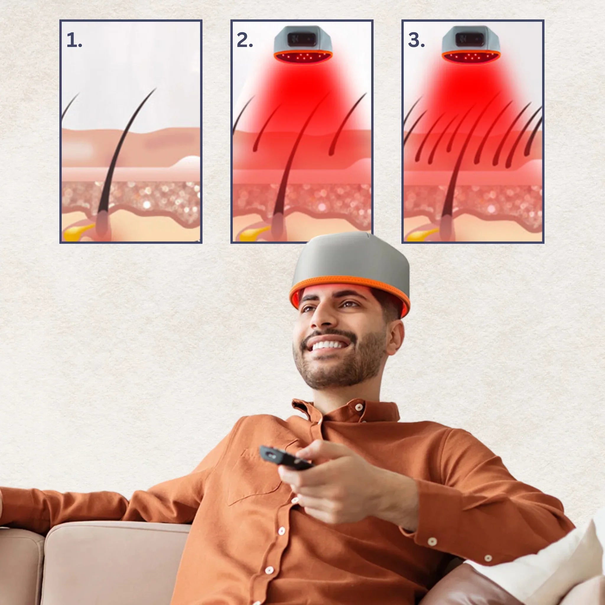 De HairRevive lichttherapie-muts maakt gebruik van geavanceerde roodlicht- en infraroodtechnologie om diep in de hoofdhuid door te dringen en haarzakjes te activeren voor voller en gezonder haar.