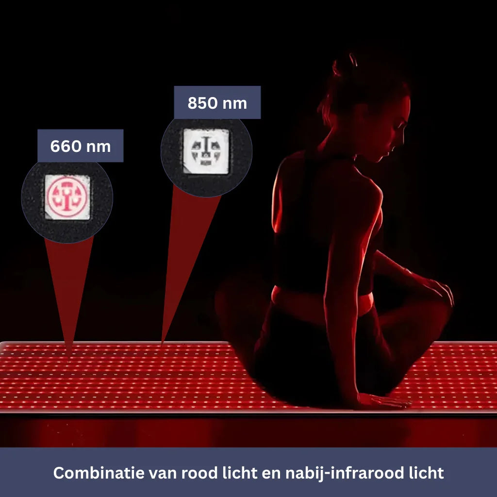 De InfraHeal‑mat maakt gebruik van een combinatie van rood licht (660 nm) en nabij-infrarood licht (850 nm).