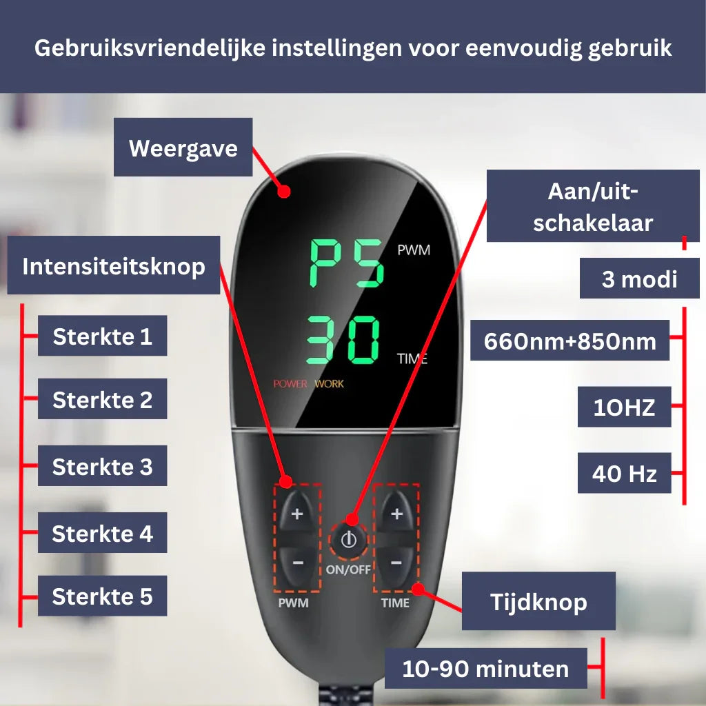 Het rode licht dringt door tot de bovenste huidlagen en bevordert de genezing van huidproblemen, terwijl het infrarode licht diepere weefsels bereikt om spieren en gewrichten te regenereren en ontstekingen te verminderen.