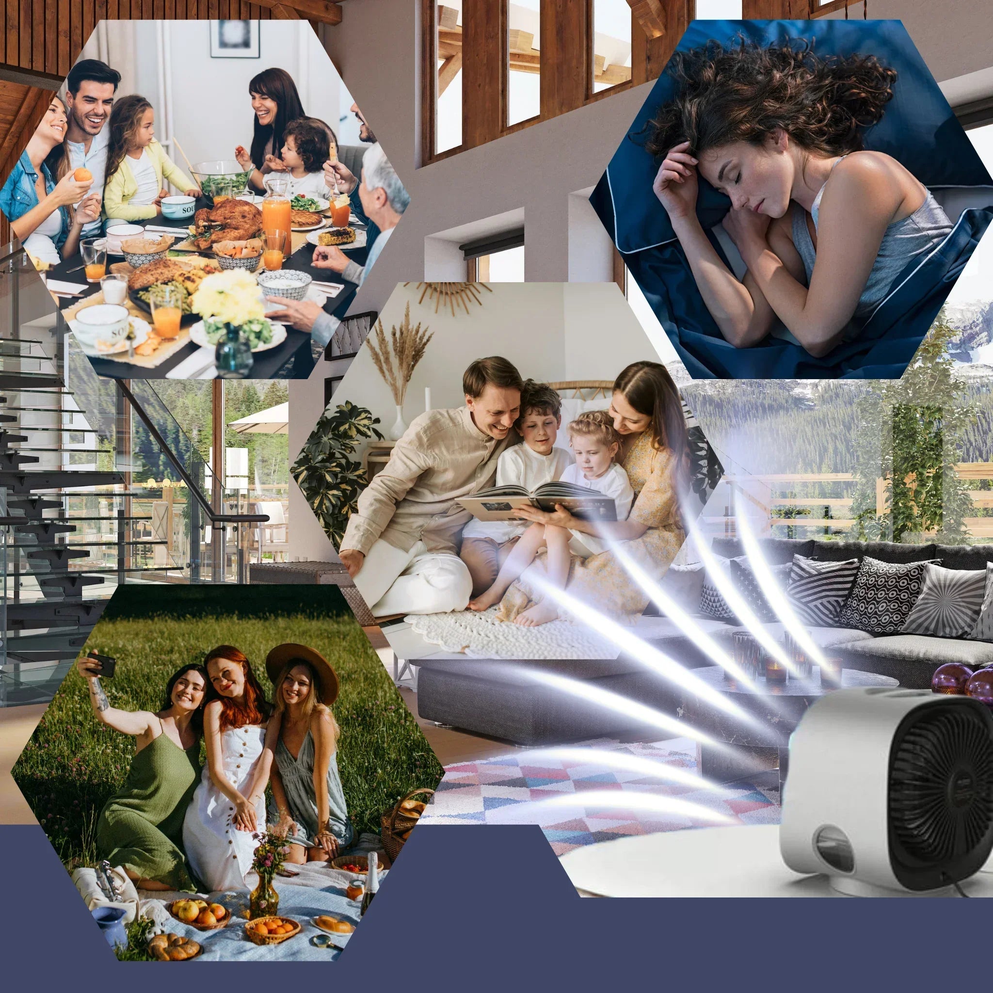 Verander je slaapkamer in een oase van comfort met fluisterstille luchtstroom en zachte nachtverlichting.