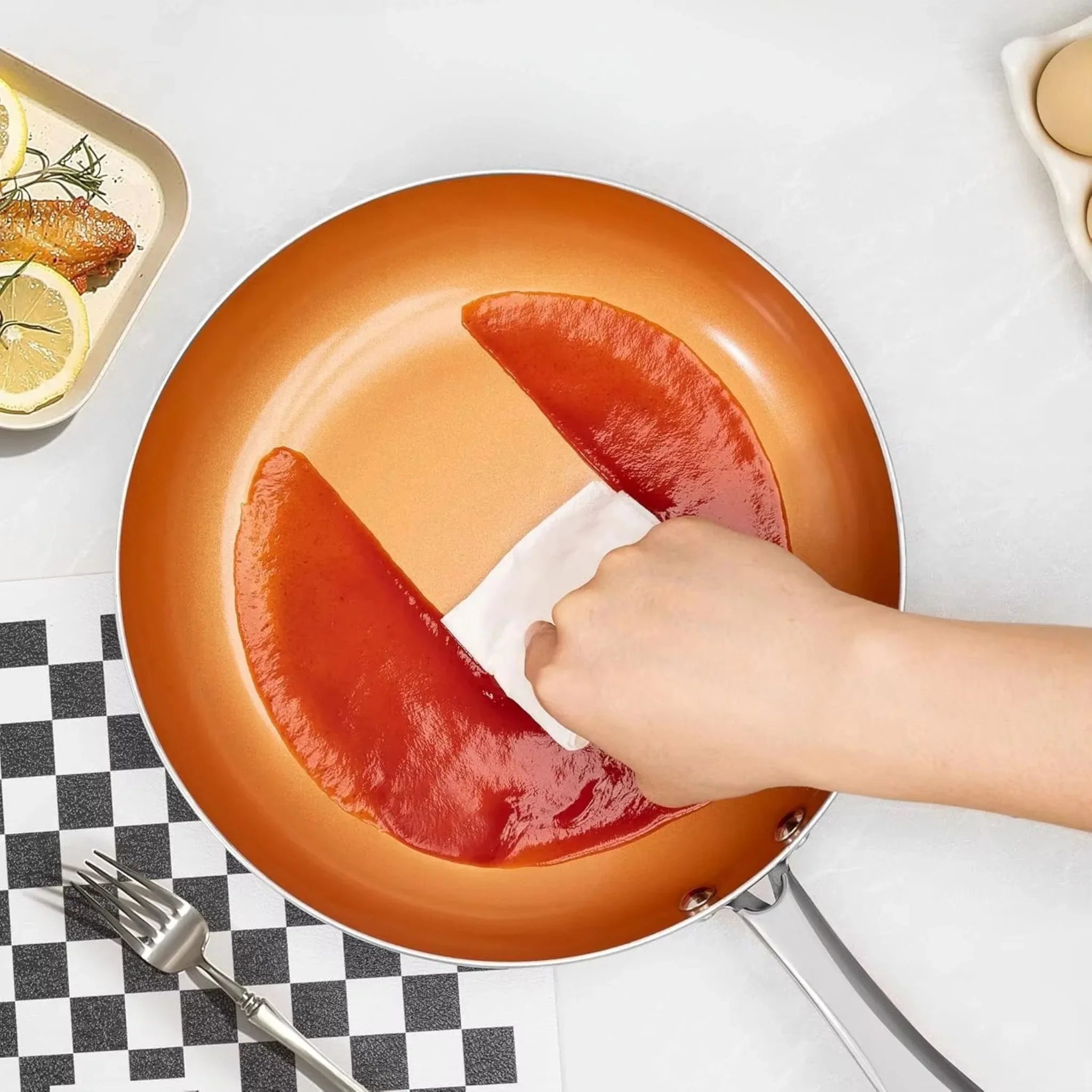 Koper bezit natuurlijke antibacteriële eigenschappen en zorgt voor een gelijkmatige warmteverdeling, waardoor voedsel zachter wordt bereid.