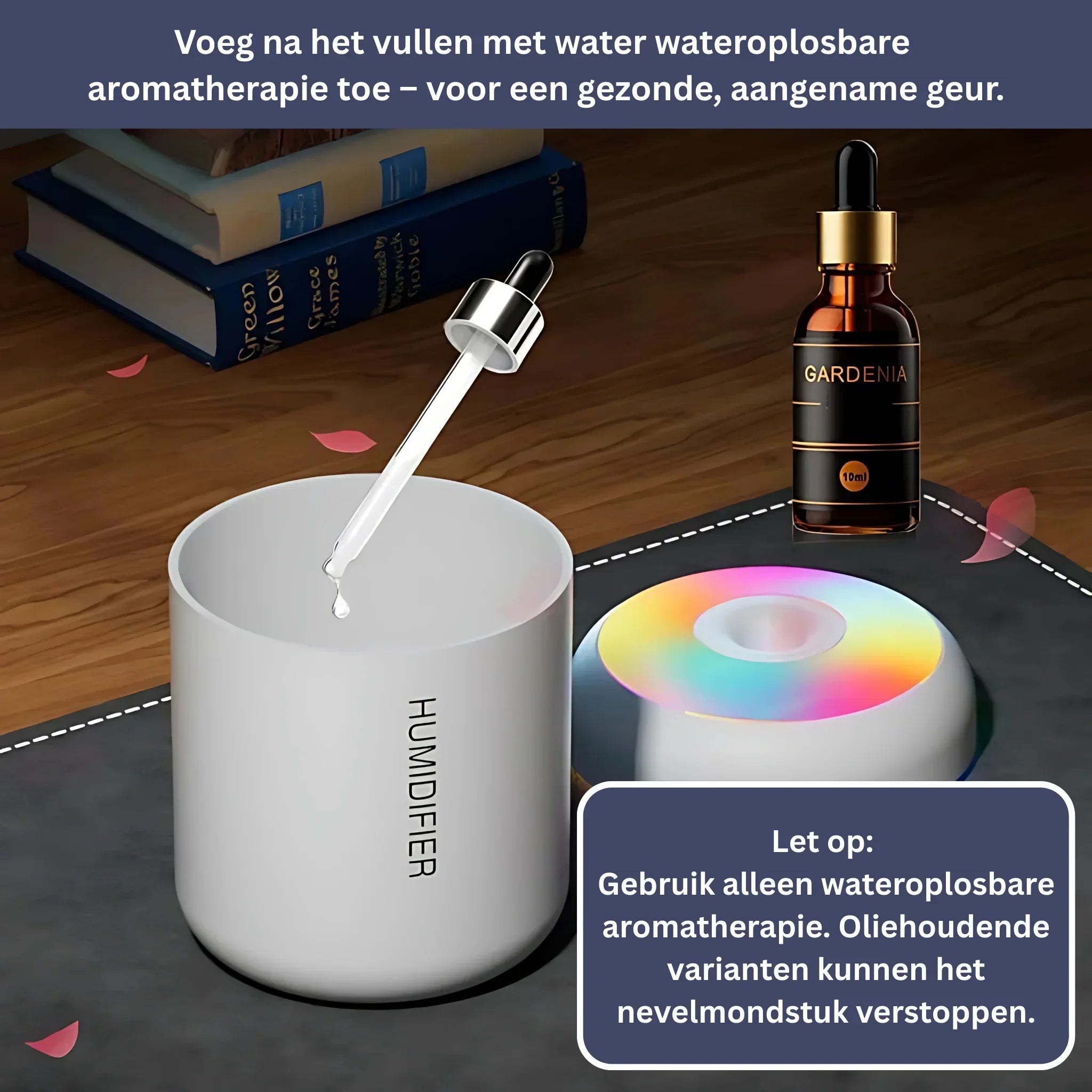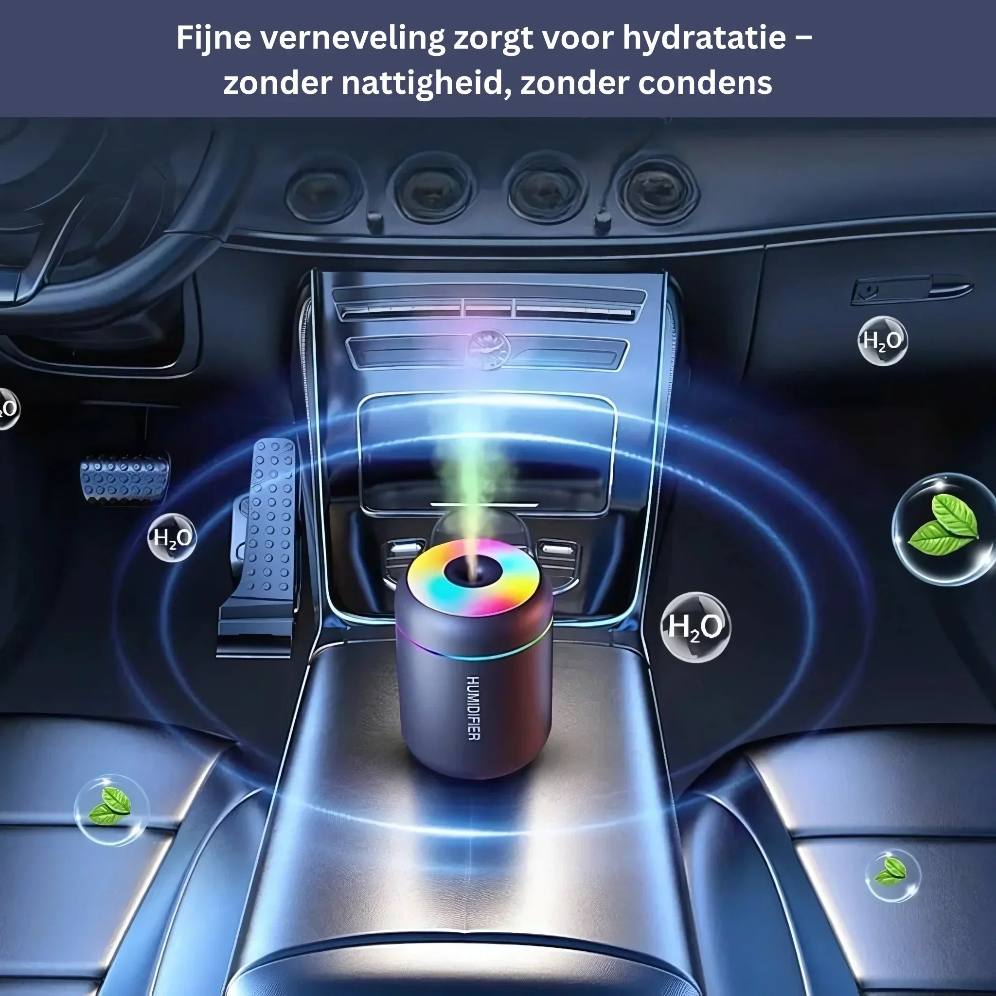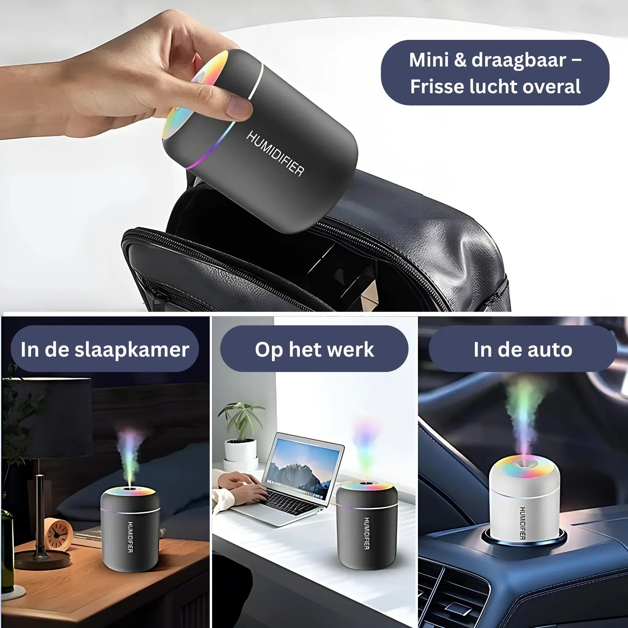 Ja, de luchtbevochtiger is USB-aangedreven en kan worden aangesloten op een laptop, powerbank of autoadapter – ideaal voor onderweg.