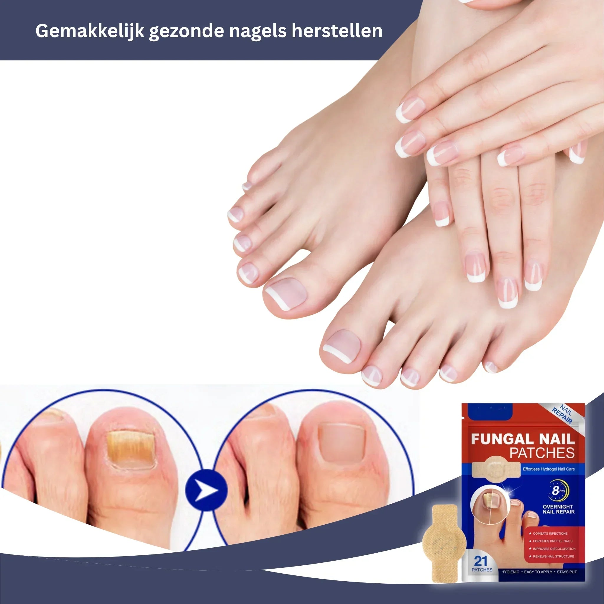 Ontwikkeld om naadloos aan te passen aan het nageloppervlak, zorgt elke patch voor een volledige bedekking van het getroffen gebied.