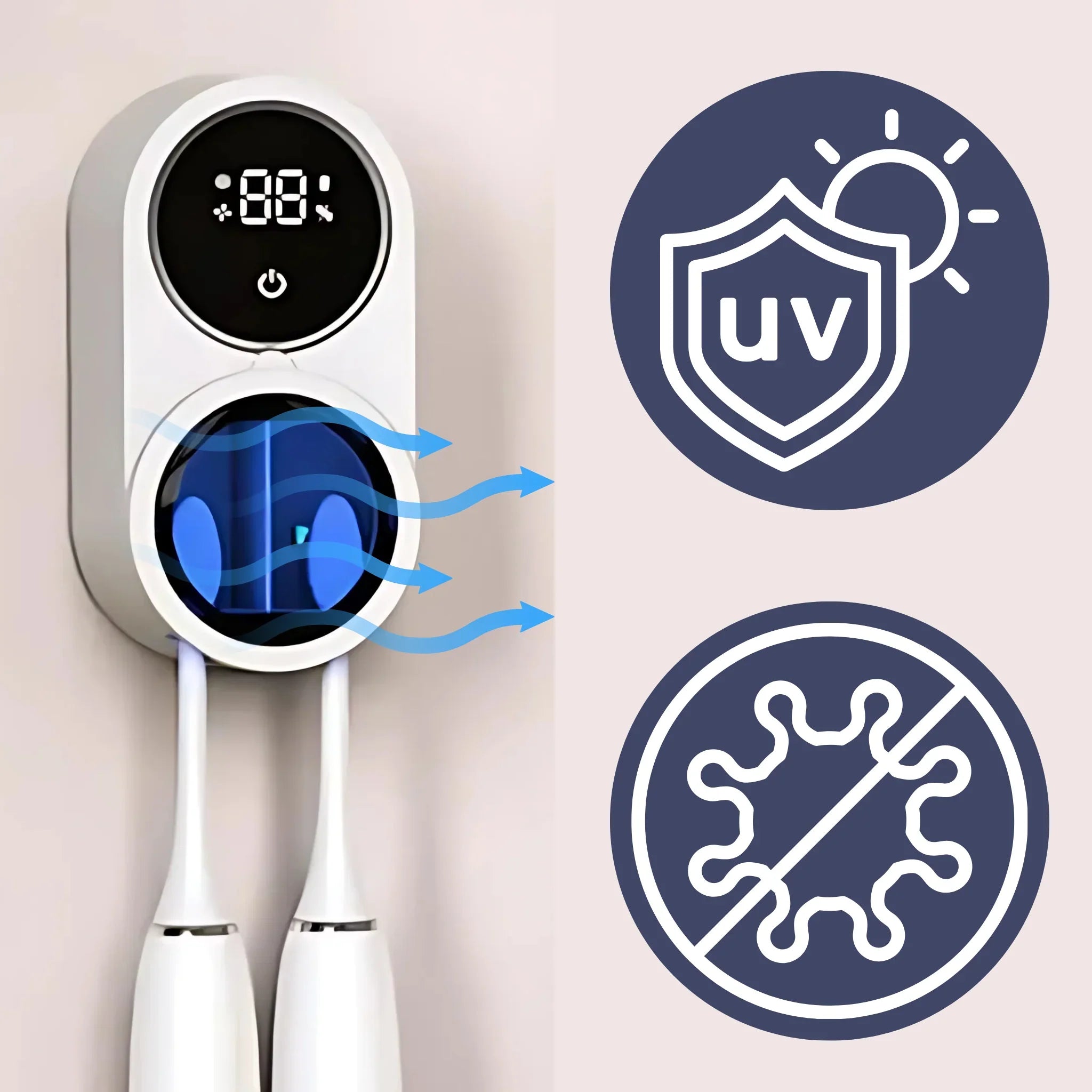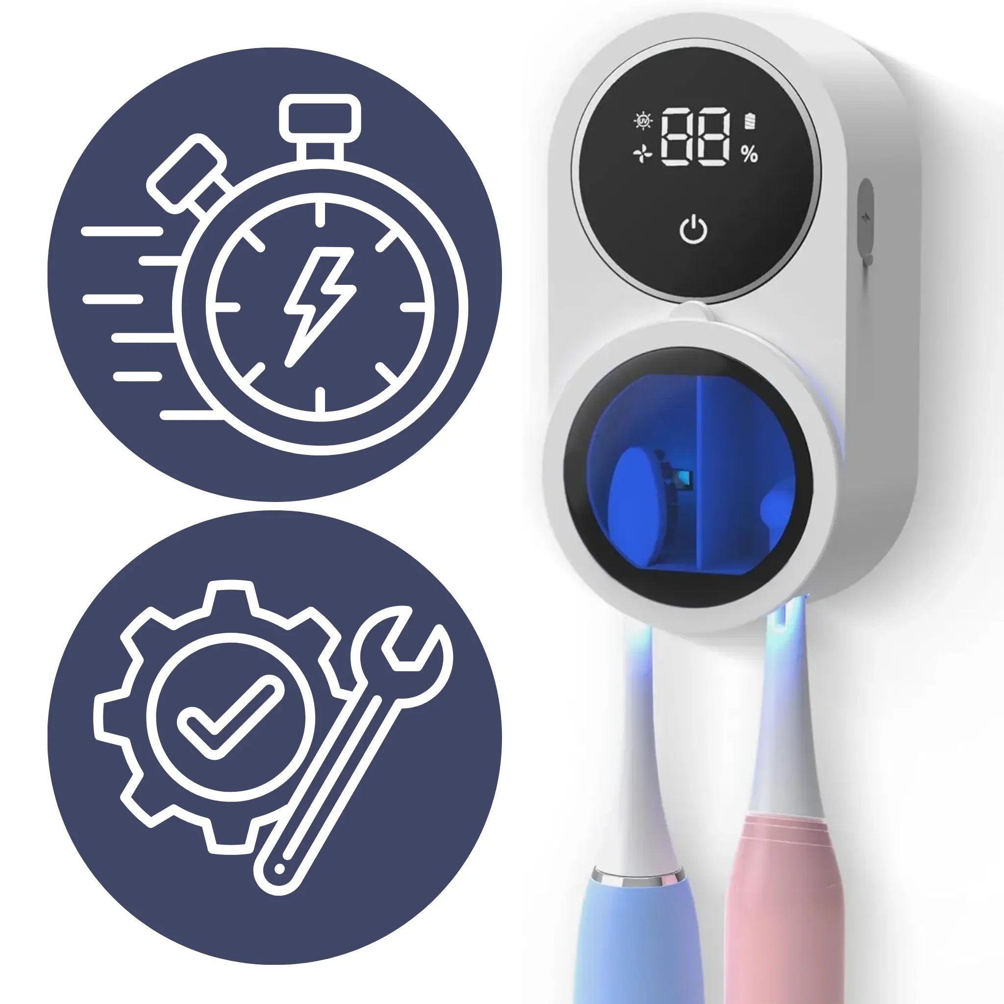 De reiniger gebruikt een combinatie van UV-licht, ventilatordroging en een luchtcirculatiesysteem om bacteriën effectief te verwijderen en je tandenborstel altijd schoon en droog te houden.