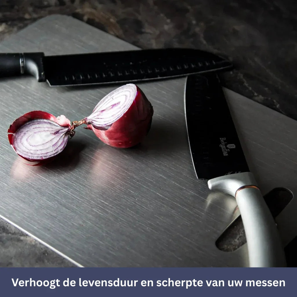 Ja, de SteelMaster Snijplank is gemaakt van speciaal roestvrij staal dat vriendelijk is voor je messen, zodat ze tijdens het snijden niet bot worden en langer scherp blijven.
