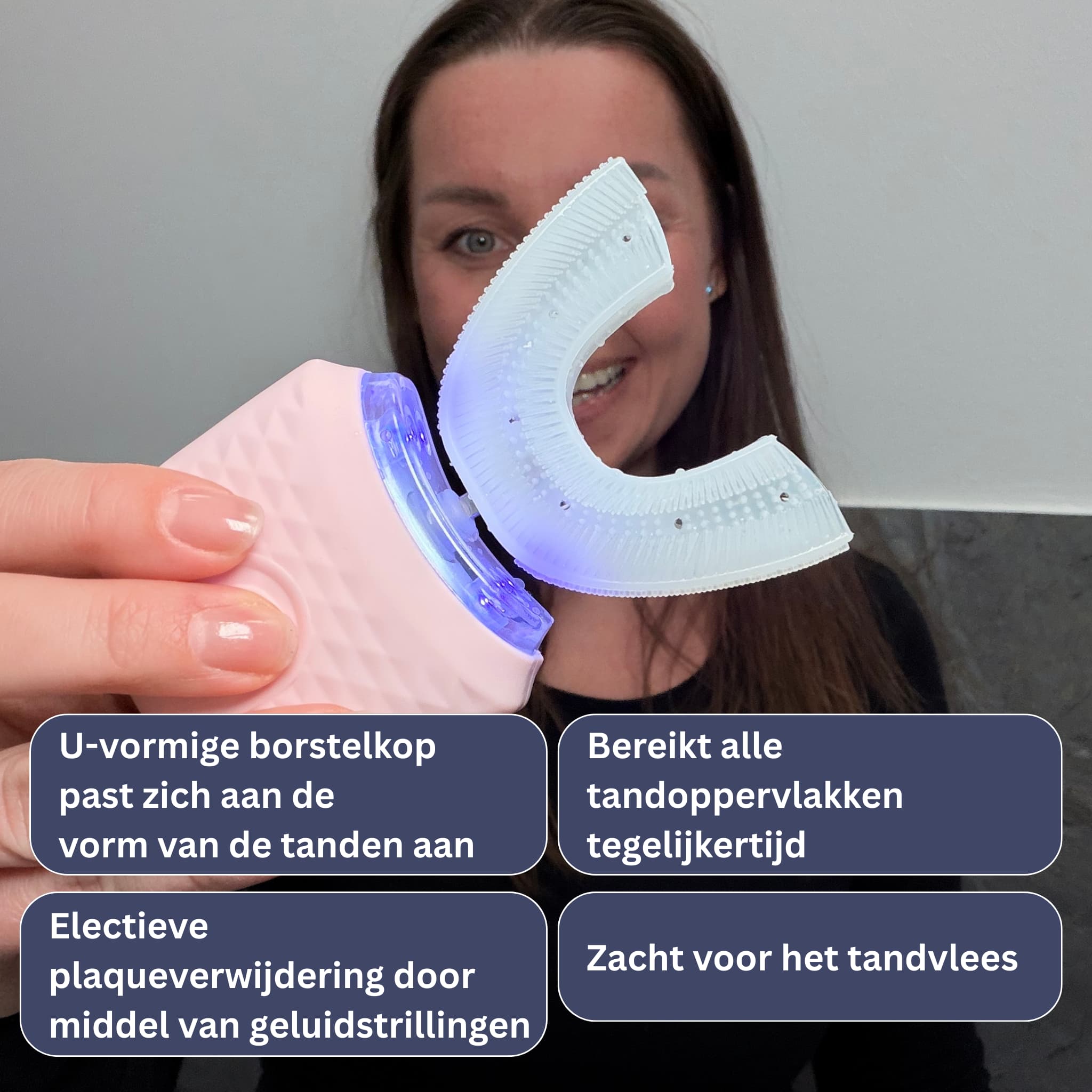 De speciaal ontworpen U-vormige borstelkop past zich precies aan je tandvorm aan en bereikt alle tandoppervlakken tegelijk.