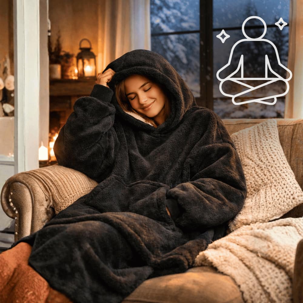 De combinatie van hoodie, deken en oversized sweatshirt zorgt voor een uniek knus draaggevoel. Het zachte fleecegevoerde materiaal omsluit het lichaam volledig en biedt direct aangename warmte.